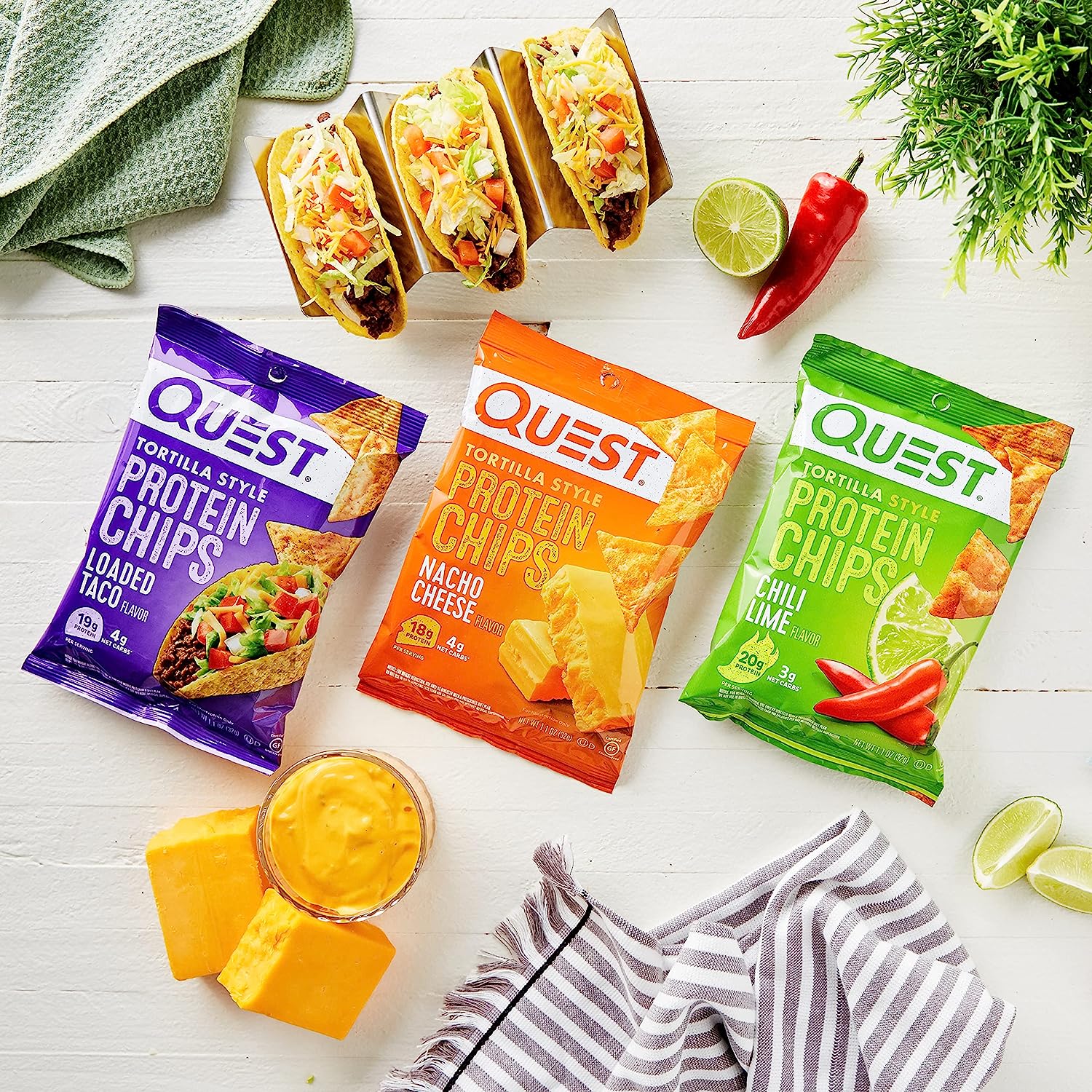 CHIPS THAT TRAVEL WITH YOU: Take Quest Tortilla Style Protein Chips with you in your backpack, purse, car console, gym bag or wherever your adventures take you. Variety pack contains 12 Quest Tortilla Style Protein Chips (4 Chili Lime flavor, 4 Nacho Cheese flavor, 4 Loaded Taco flavor)